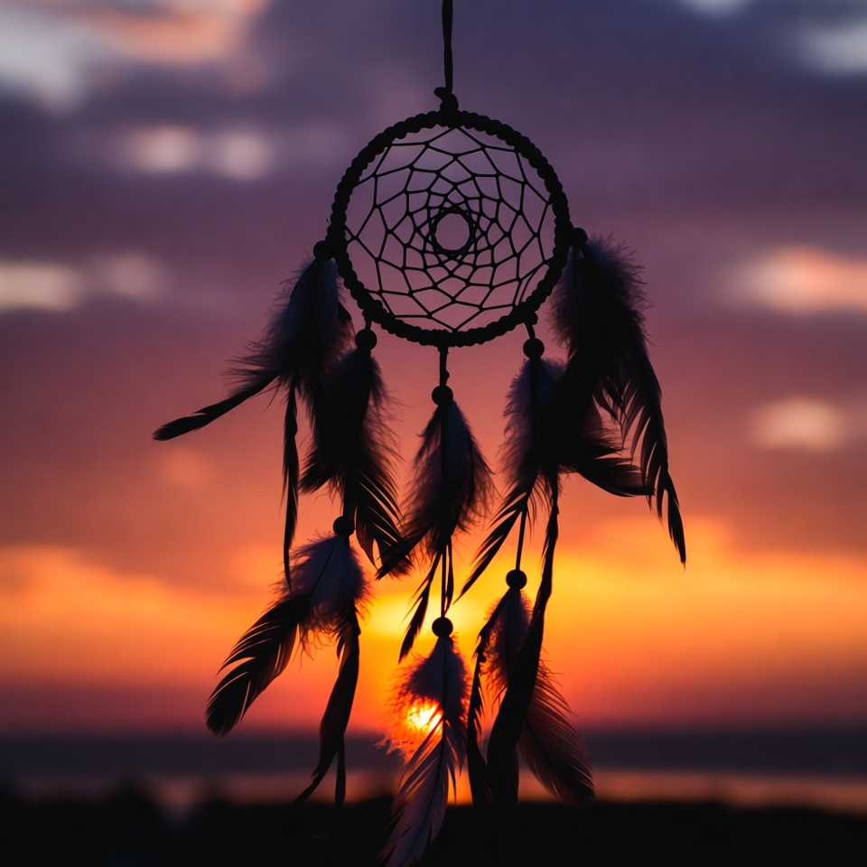 A dreamcatcher with white feathers and intricate web hangs from a string against a vibrant sunset sky. The purple and orange hues of the sky create a striking backdrop, with the dreamcatcher silhouetted in the foreground. Feathers dangle gracefully below the circular frame.