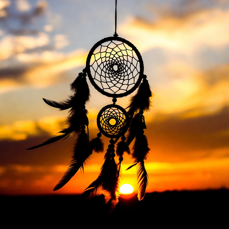A dreamcatcher with a woven web and long feathers hangs against a vibrant sunset sky. The orange and purple hues of the horizon backlight the dark silhouette of the dreamcatcher. Feathers dangle from the bottom, swaying gently.
