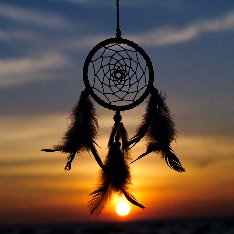 A black silhouette dreamcatcher with intricate web and multiple feathers hangs from a string. It is set against a vibrant sunset sky transitioning from deep blue to orange hues. The sun glows brightly near the bottom of the image.