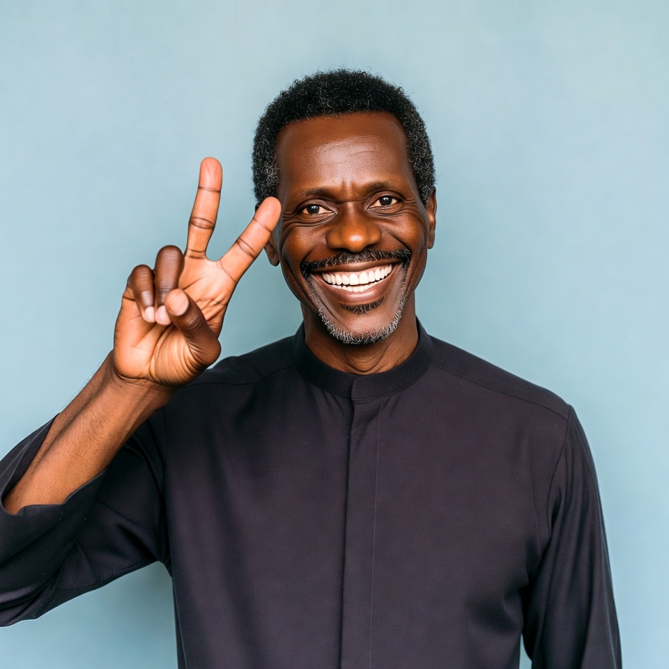 A smiling African man with short curly hair and a mustache stands against a light blue background. He wears a black collared shirt and raises his right hand to form a peace sign with his fingers. His expression is joyful and engaging.