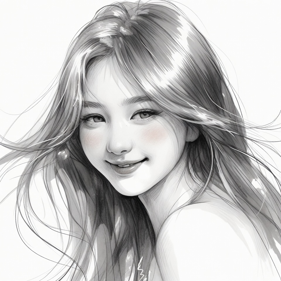 Asian, anime style, artwork, beautiful, blush, detailed, digital art, drawing, eyes, face, female, flowing hair, gentle smile, illustration, isolated, long hair, pencil sketch, portrait, realistic drawing, smiling, soft features, white background, young, woman