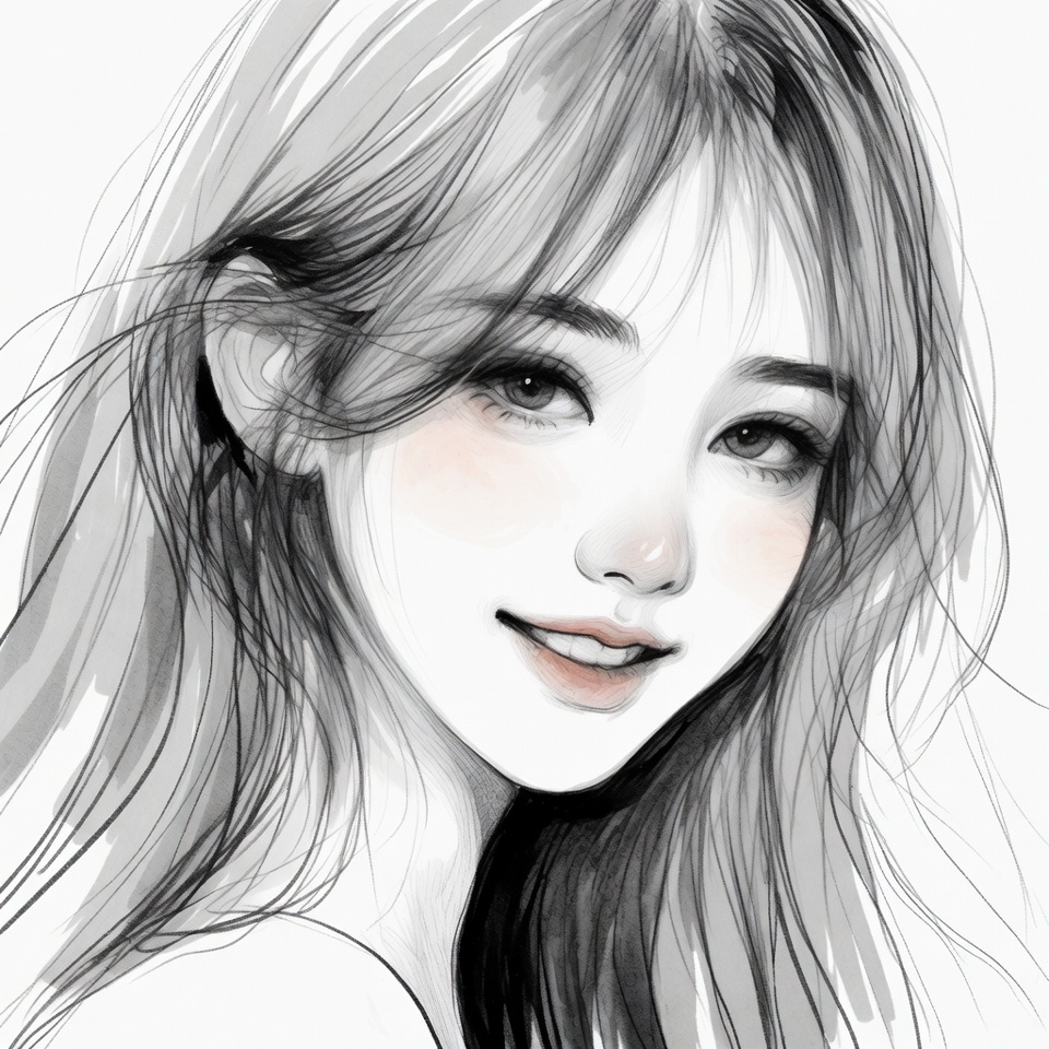 A detailed watercolor-style illustration of a young Asian woman with long flowing hair and bangs. She has soft facial features, blushing cheeks, glossy lips, and a gentle smile, gazing slightly to the side. The artwork features delicate brush strokes in grayscale tones with subtle pink highlights on an isolated white background.
