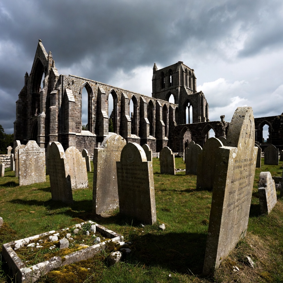 A dramatic view of a ruined Gothic abbey with tall arched windows and crumbling stone towers stands amidst a graveyard under a dark cloudy sky. Numerous weathered gravestones and tombs covered in moss are scattered across the green grass foreground. Shadows from the clouds add depth to the ancient stone ruins.
