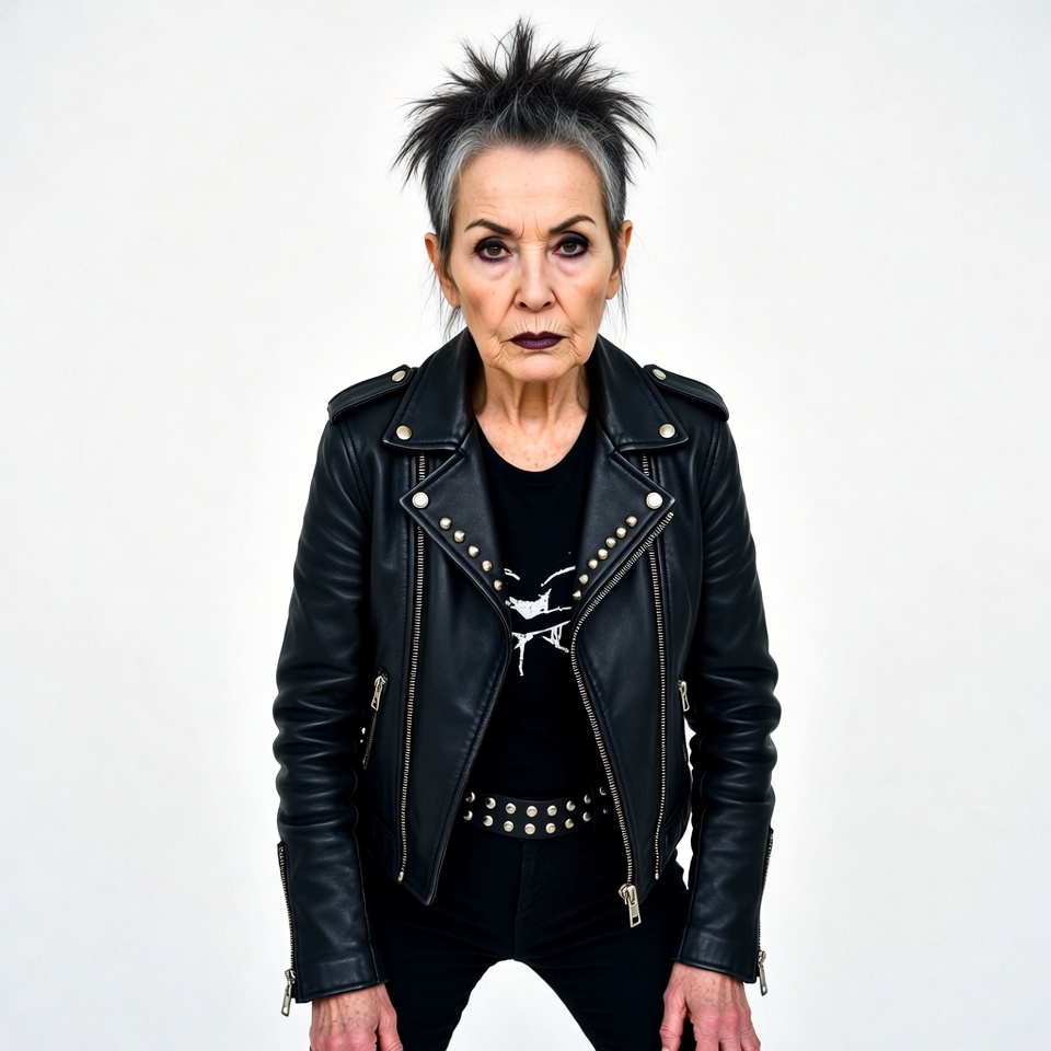 White, black leather, black pants, confident pose, edgy look, elderly woman, fashion, female, gray hair, intense expression, leather jacket, leatherwear, mature woman, portrait, punk fashion, punk style, rocker, silver studs, spiked hair, standing pose, studs, white background, woman