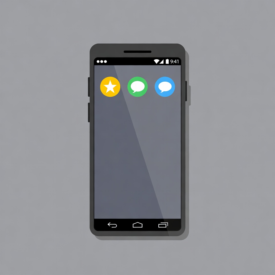 A black Android smartphone is displayed on a gray background with a flat illustration style. It features a yellow star, green chat bubble, and blue chat bubble icons on the screen. The phone shows navigation buttons at the bottom.