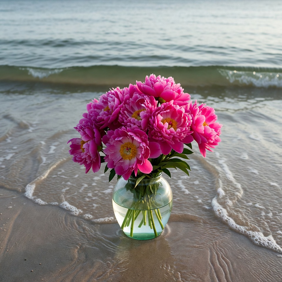 A bouquet of vibrant pink peonies sits in a clear glass vase on wet sand at the beach. Gentle waves lap around the base of the vase, with a serene ocean and sky in the background. The flowers are lush and fully bloomed, contrasting beautifully with the natural seashore setting.