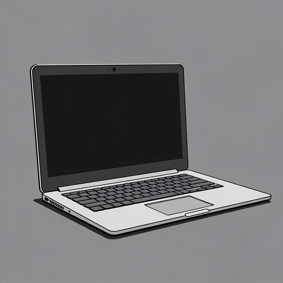 black screen, clipart, computer, digital device, illustration, isolated background, keyboard, line drawing, notebook computer, portable computer, silver laptop, tech illustration, trackpad, webcam, laptop