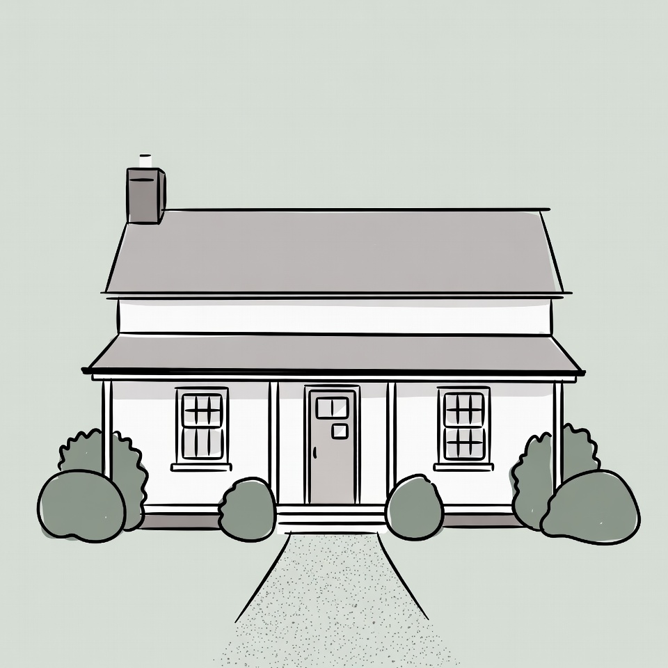 A simple line drawing illustration depicts a white two-story house with a gray sloped roof and brick chimney. The house features a front porch with a central door flanked by two windows, and symmetrical bushes on either side. A walkway leads to the porch on an isolated light green background.