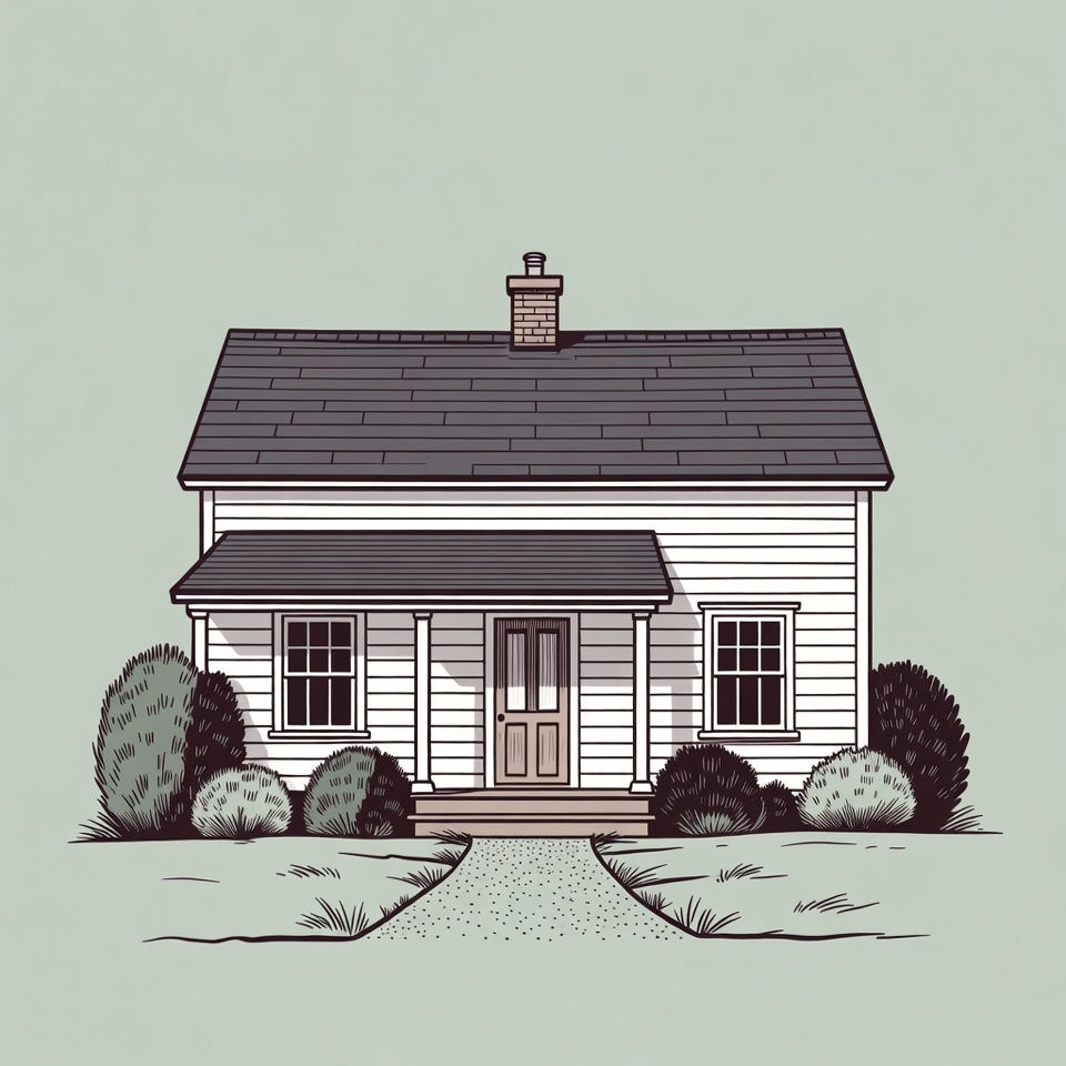 A hand-drawn illustration depicts a white clapboard house with a dark shingled roof and covered front porch. Flanking bushes frame the house, with a stone pathway leading to the wooden front door and windows on either side. A chimney rises from the roof against a light green background.