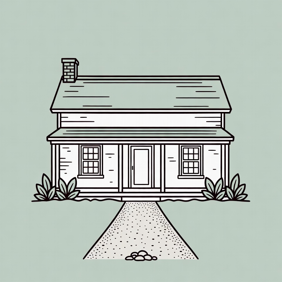 A minimalist line drawing of a two-story country house with a chimney, front porch, and two windows flanking the door. Large leaves frame the house on both sides, and a gravel path leads to the entrance. The illustration features clean white lines on a light green background.