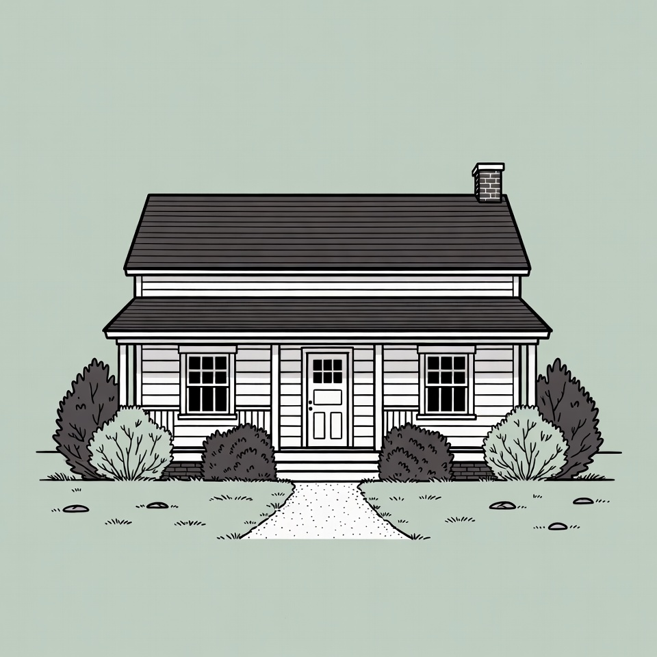 A simple black line illustration of a classic white farmhouse with a gabled roof, chimney, and front porch. Symmetrical bushes frame the house on either side of a stone walkway leading to the central door. Flanked by two windows, the house sits on a grassy area against a light green background.