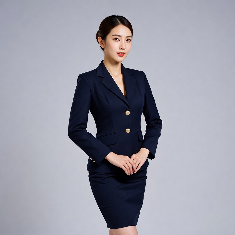A young Asian woman with dark hair in an updo stands confidently against a gray background. She wears a tailored navy blue blazer with gold buttons, a deep V-neckline, and a matching knee-length pencil skirt. Her hands are clasped in front, and she smiles subtly at the camera.