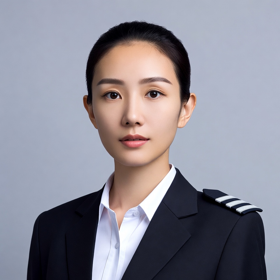 A young Asian woman with black hair in a neat bun poses for a professional headshot against a gray background. She wears a black pilot uniform jacket with white shirt and gold-striped epaulets on the shoulders. Her expression is calm and confident.