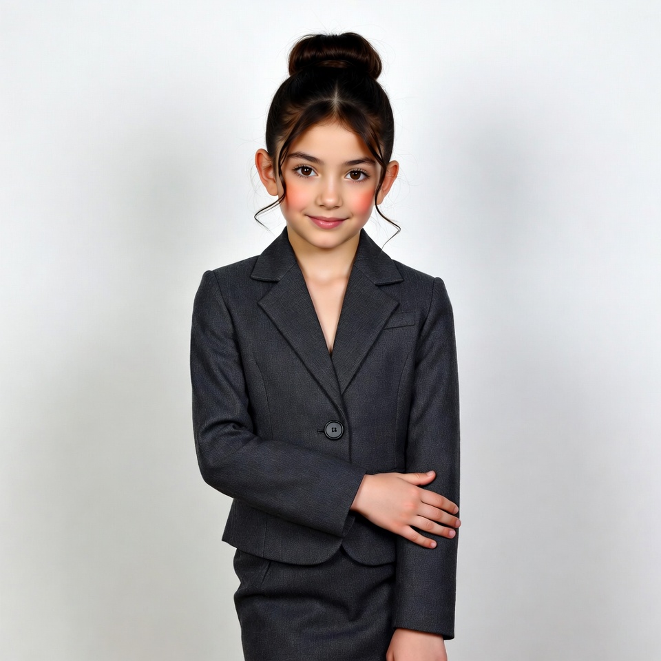 A young girl with dark curly hair in a bun stands smiling against a white background. She wears a fitted gray blazer with a notched lapel and button details. Her arms are crossed casually in front of her.