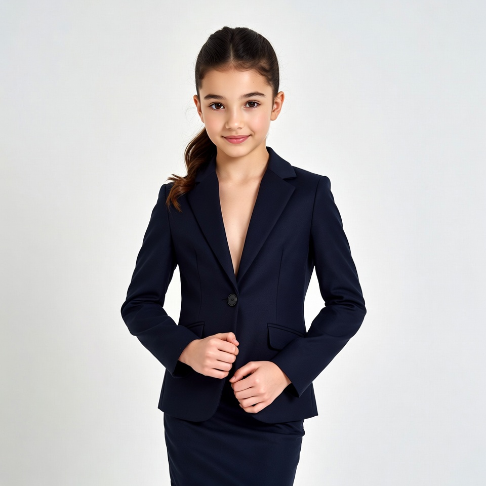 A young girl with dark hair in a ponytail stands smiling against a white background. She wears a navy blue blazer with a deep V-neck and matching skirt. Her hands are clasped in front of her.