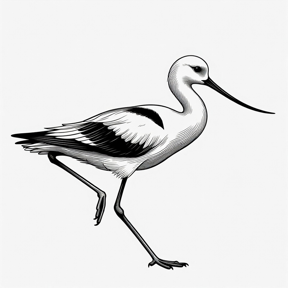 bird, black and white, black wings, clipart, detailed drawing, elegant bird, feathers, illustration, isolated background, line art, long beak, nature illustration, one leg, shorebird, standing bird, vector art, wading bird, white bird, wildlife art, avocet