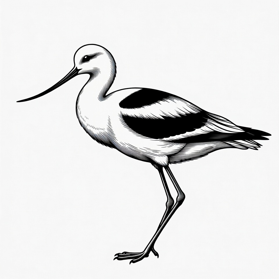 bird, black and white, clipart, engraving style, feathers, illustration, isolated, long bill, long legs, one leg, shorebird, standing, stilt bird, wading bird, white background, wildlife, black-winged stilt