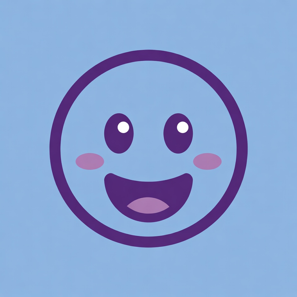 big eyes, blue background, cartoon, clipart, cute face, emoji, happy face, illustration, isolated background, kawaii, purple outline, rosy cheeks, smiling emoji, vector art, wide smile, smiley face