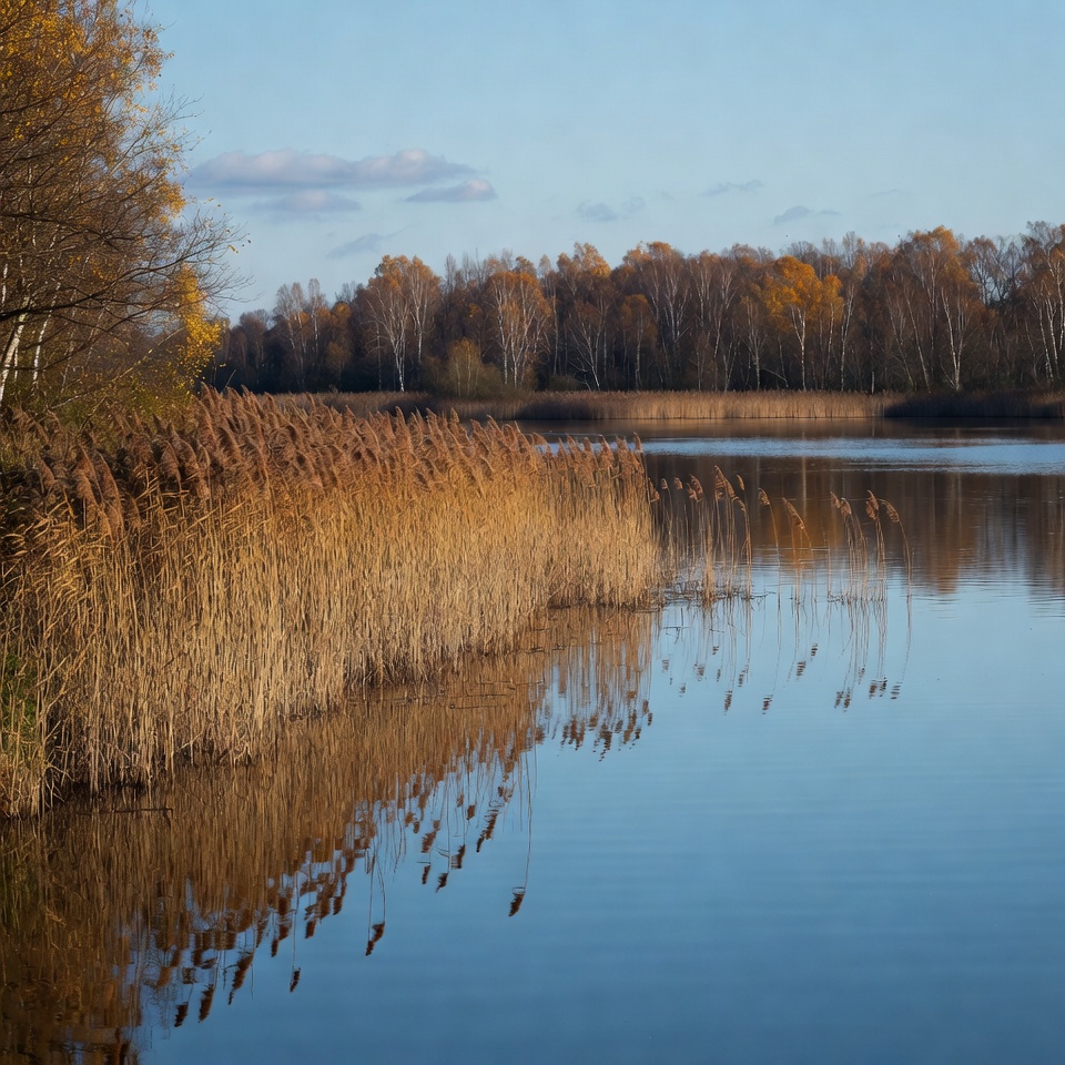 autumn landscape, birch trees, blue sky, calm water, clouds, fall foliage, foliage, forest background, golden reeds, lake, lakeside, landscape, natural scenery, nature, orange leaves, outdoor, phragmites, reeds, reflection, seasonal, vibrant colors, water, wetland, yellow trees, autumn reeds