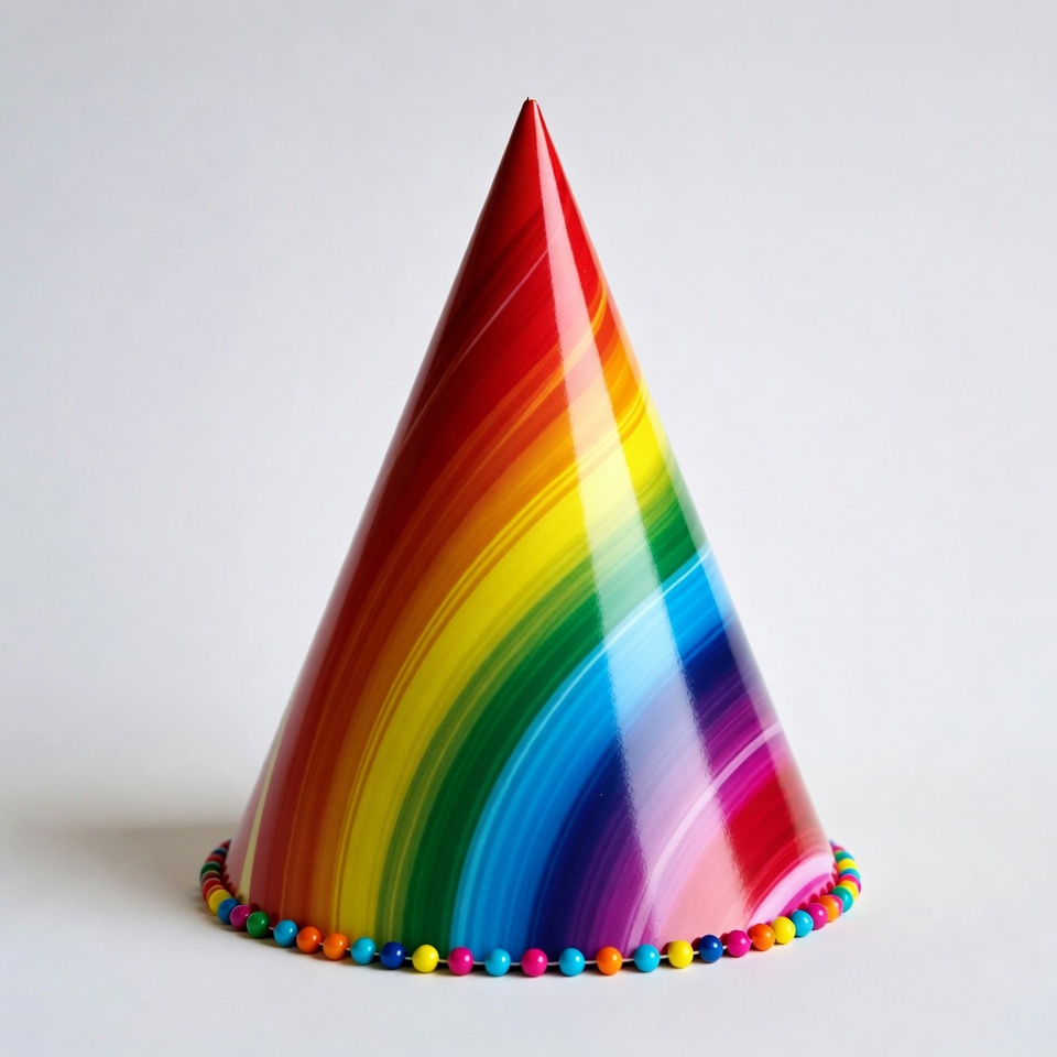 A shiny conical party hat features swirling rainbow colors from red to violet. It has a colorful beaded trim around the base in multiple hues. The hat stands isolated against a white background.