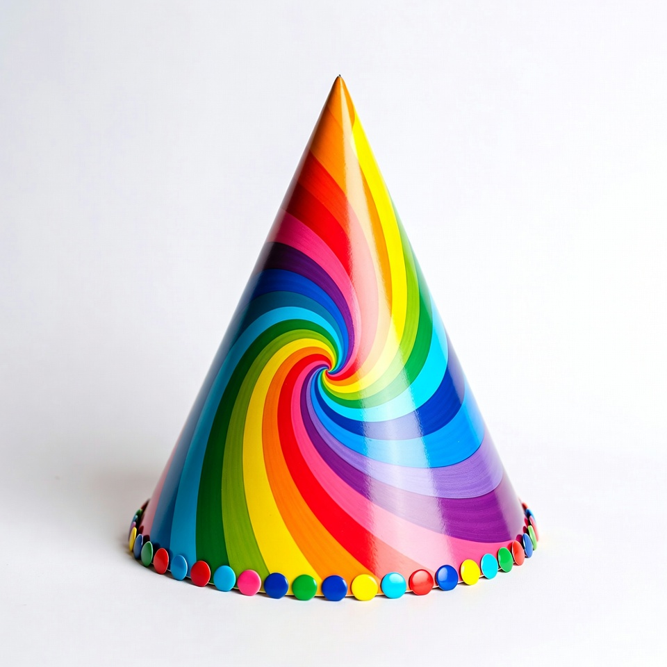 birthday hat, blue purple, colorful hat, cone hat, dotted trim, festive hat, isolated background, rainbow colors, red orange, swirl design, white background, yellow green, party hat
