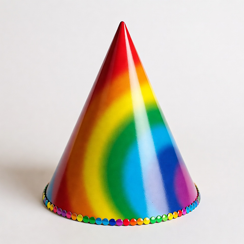 birthday hat, celebration hat, clipart, colorful hat, cone hat, festive hat, gradient rainbow, illustration, isolated background, multicolored sequins, rainbow colors, red tip, party hat