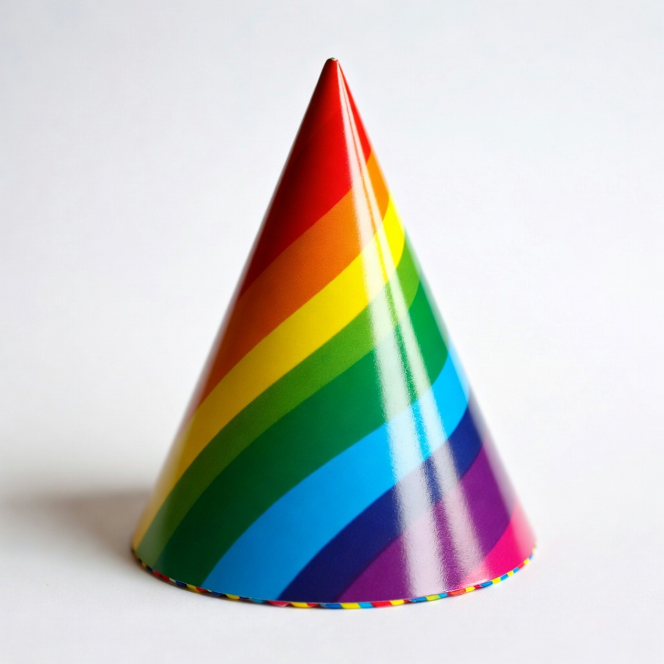 birthday hat, celebration, colorful hat, cone hat, conical hat, festive, green blue purple, isolated background, party hat, rainbow stripes, red orange yellow, shiny hat, vibrant colors, white background, rainbow hat