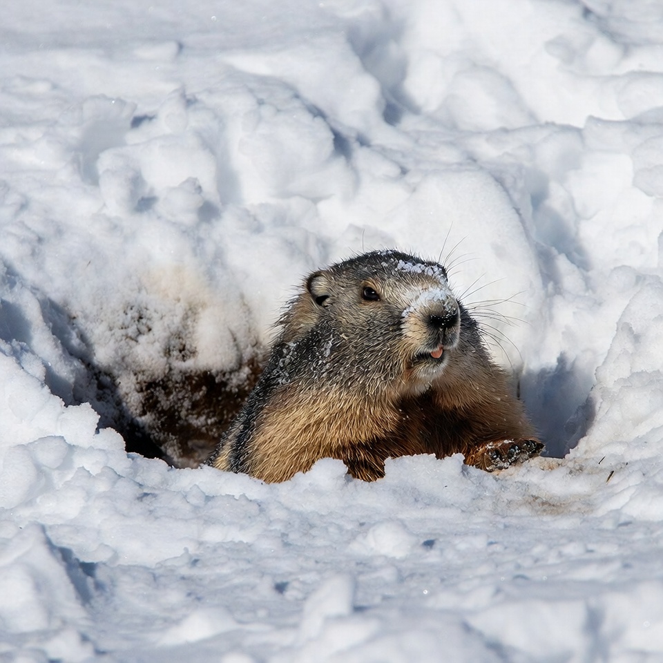 animal, brown fur, burrow, cold, cute animal, emerging, gray fur, isolated background, mountains, nature, peeking, rodent, snow, snowy landscape, tongue, whiskers, wildlife, winter, marmot