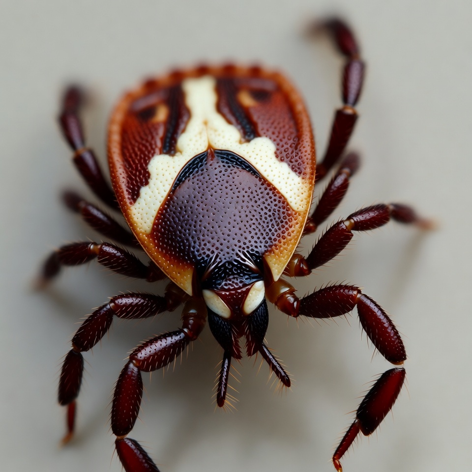 A close-up view of a shield bug with a distinctive red body and white markings on its shield-shaped back. The bug has long thin legs and prominent antennae, positioned on a plain light background. Its detailed exoskeleton shows reddish-brown hues with creamy white patterns.