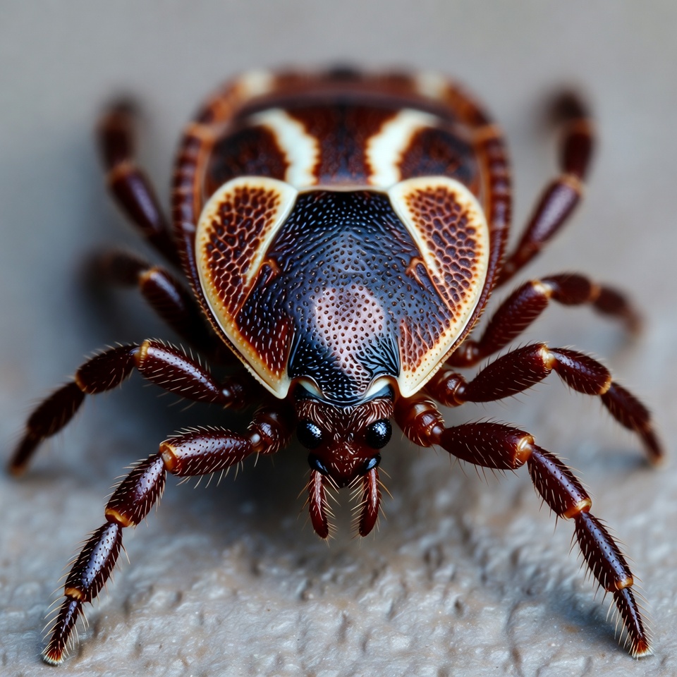arachnid, black pattern, brown tick, bug, cephalothorax, closeup, creepy crawly, detailed, eight legs, fangs, glossy, gray background, hairs, insect, legs, macro photography, nature, parasite, spider-like, textured body, white markings, wildlife, tick