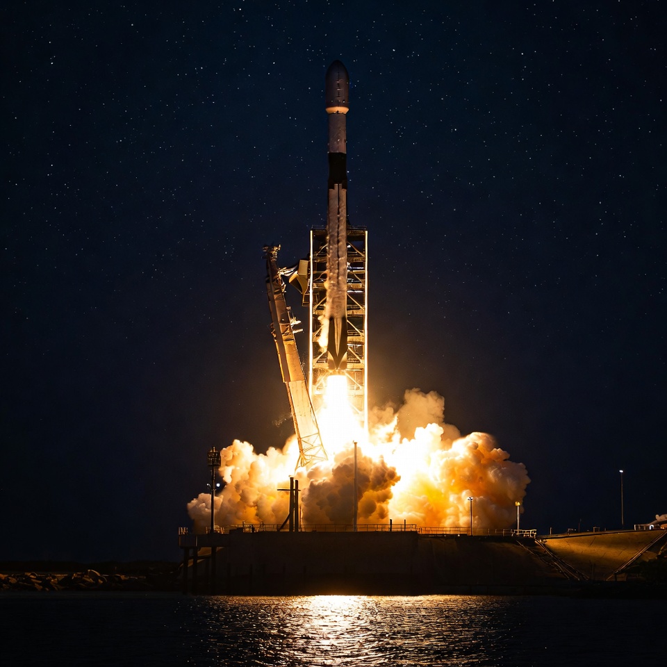 A SpaceX Falcon 9 rocket launches at night from a coastal pad, surrounded by a launch tower. Bright flames and thick smoke erupt from its engines as it ascends. Stars fill the dark sky, with water reflecting the launch glow in the foreground.