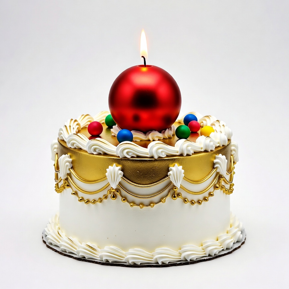 cake, celebration cake, clipart, dessert, festive cake, gold frosting, icing, isolated background, lit candle, multicolored balls, red ball, red candle, scalloped edges, white cake, birthday cake