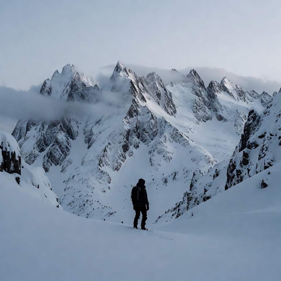 A lone hiker in a black jacket and backpack stands on a snowy ridge overlooking jagged snow-covered mountain peaks. Thick clouds partially obscure the sharp summits in the background. The scene features a vast expanse of white snow under a pale sky.