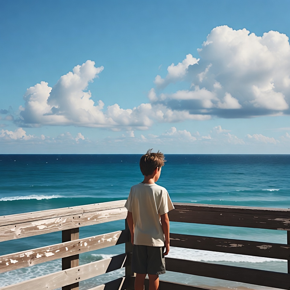 A young boy with light brown hair stands on a weathered wooden pier, facing away toward the turquoise ocean. He wears a light-colored t-shirt and shorts, with waves gently crashing below and fluffy white clouds dotting the clear blue sky.
