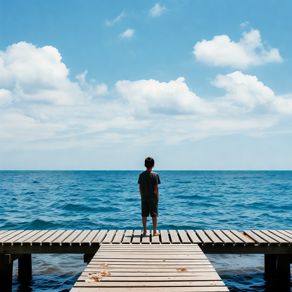 A young boy with short dark hair stands on a wooden pier facing the vast blue ocean. He wears a gray t-shirt and shorts, viewed from behind against a bright blue sky with fluffy white clouds. The pier extends over calm blue waters with gentle waves.