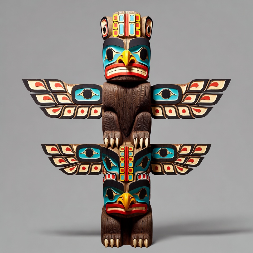 Haida style, Native American art, Pacific Northwest, Tlingit art, animal figures, bear carving, blue eyes, brown wood, carving, colorful patterns, cultural symbol, detailed woodwork, eagle head, geometric designs, indigenous art, isolated background, red beak, traditional art, tribal totem, vertical pole, vibrant colors, wings, wooden sculpture, totem pole