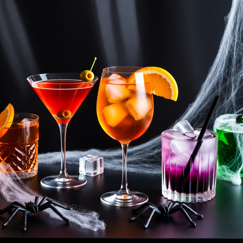 Five colorful cocktails in elegant glasses stand on a black table decorated with spider webs and plastic spiders. The drinks feature red martini with olives, orange spritz with orange slice, amber whiskey, purple cocktail with straw, and green drink with ice. A dark draped background enhances the spooky Halloween theme.