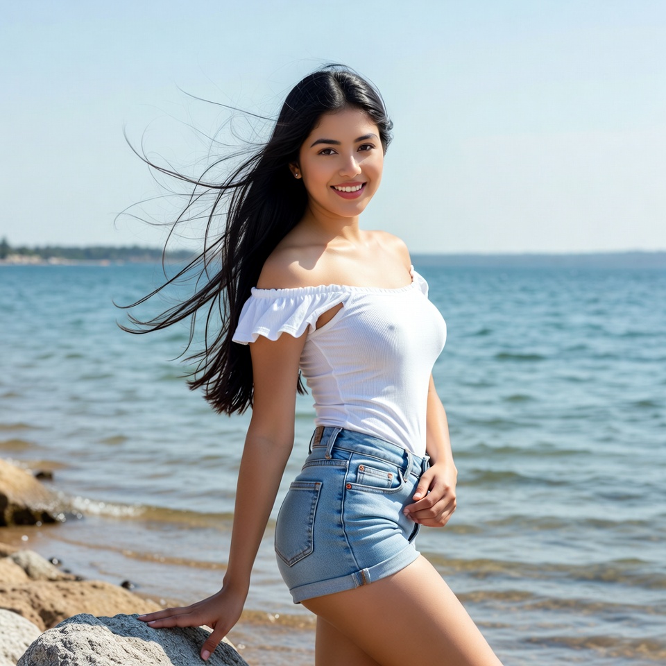 Asian, beach, black hair, blue sky, denim shorts, female, flowing hair, hand on rock, happy, lake, long hair, off-shoulder top, outdoor, portrait, rocks, smiling, standing, summer, water background, white top, young woman, woman