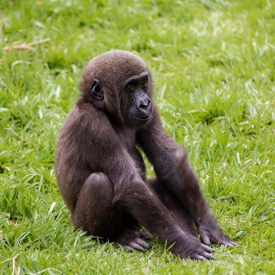A young baby gorilla with dark brown fur sits on lush green grass. It has large expressive eyes and is positioned with its arms resting on its knees. The gorilla gazes slightly to the side against a natural grassy background.