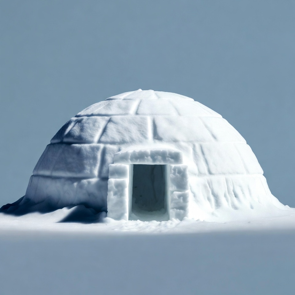 A traditional igloo made of snow blocks sits on a snowy base against a plain light blue background. The dome-shaped structure features a low arched entrance framed by ice blocks. Snow dusts the top and sides of the igloo.