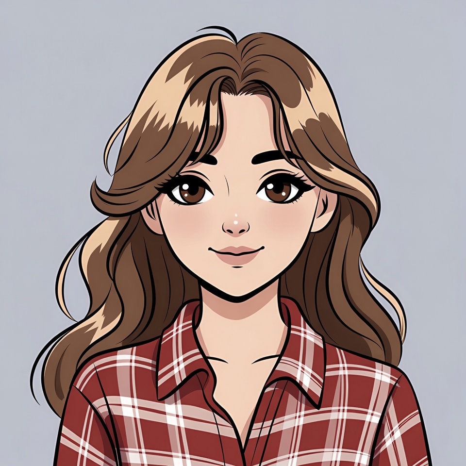 A cute anime-style illustration of a young woman with long wavy brown hair and large brown eyes. She has a gentle smile and fair skin, wearing a red and white plaid shirt. The portrait is set against a plain light blue background.