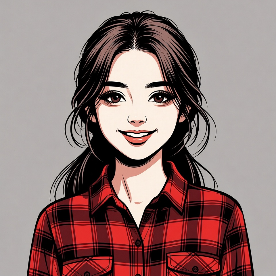 Asian, anime, black plaid, brown hair, cartoon, checkered shirt, drawing, eyes, face, female, illustration, isolated background, lips, long hair, plaid shirt, ponytail, portrait, red shirt, smiling, young woman, woman