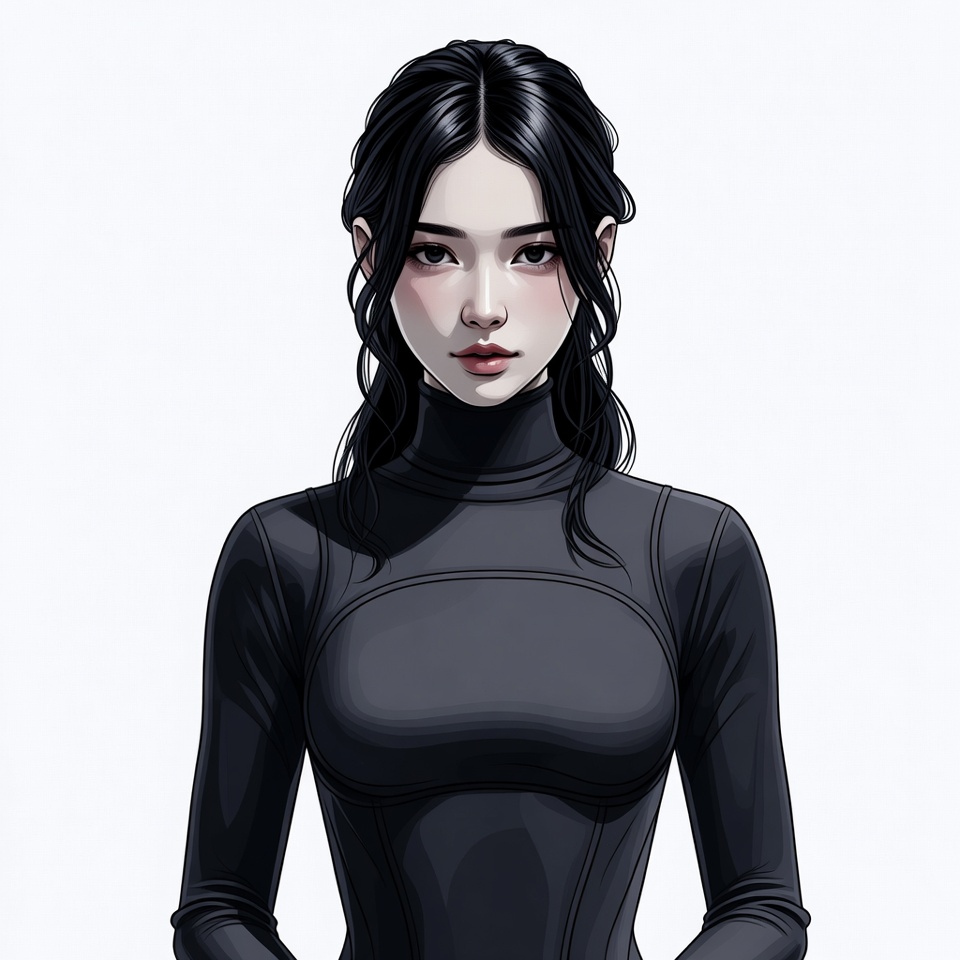 An anime-style illustration of a young Asian woman with long black hair styled in loose waves. She wears a form-fitting black turtleneck top with a high collar and subtle sheen. She stands against a plain white background with a neutral expression.