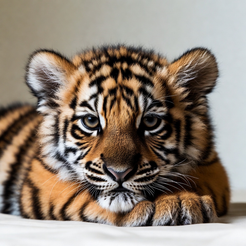 A fluffy tiger cub with orange fur and black stripes lies on a white surface. It gazes forward with large, expressive blue eyes and rests its head on its paws. The cub's whiskers and soft fur are prominently visible in the detailed portrait.
