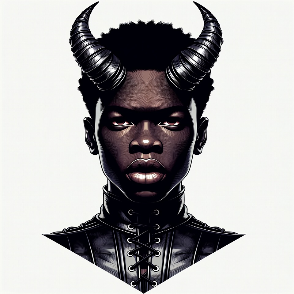 A digital illustration of an African man with a stern expression and large curved black demon horns protruding from his short curly black hair. He wears a black leather collar and outfit with lacing details. The portrait is set against an isolated white background.