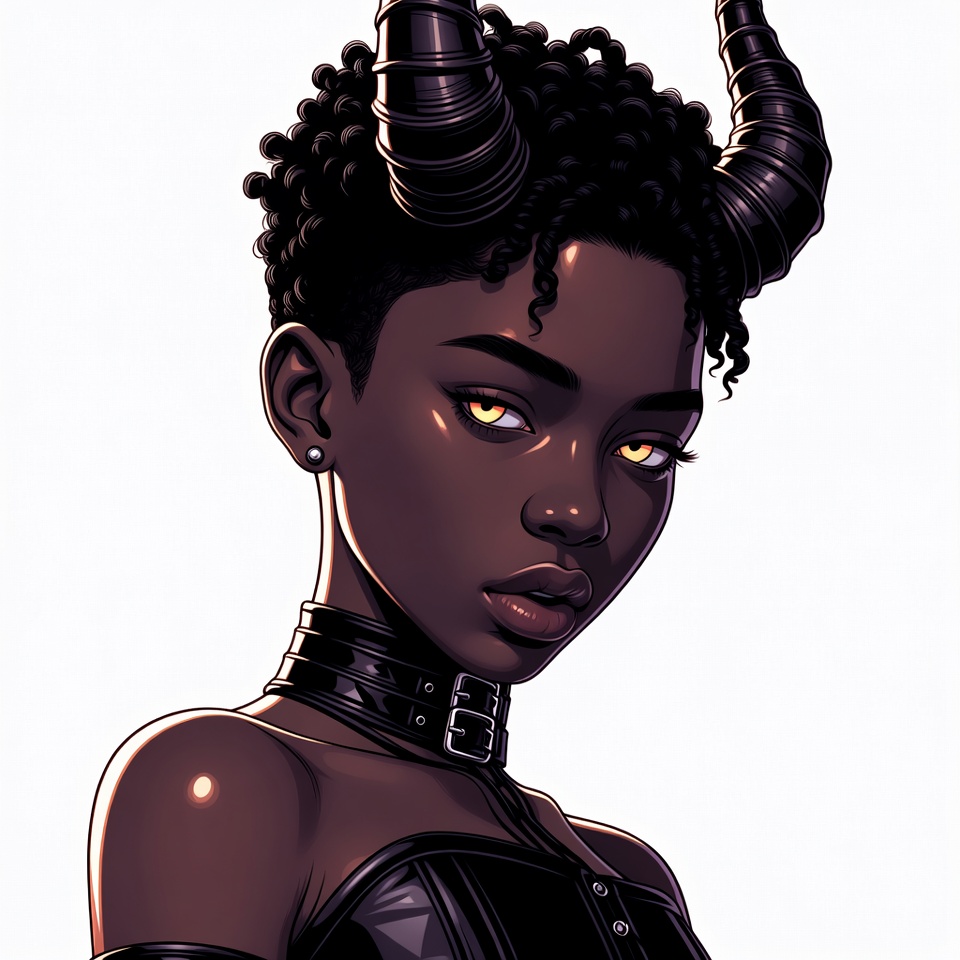 A digital illustration of a young Black woman with curly black hair and large curved black demon horns. She has striking yellow eyes, full lips, and wears a black leather choker and corset top. The portrait is on a white isolated background with glossy shading.
