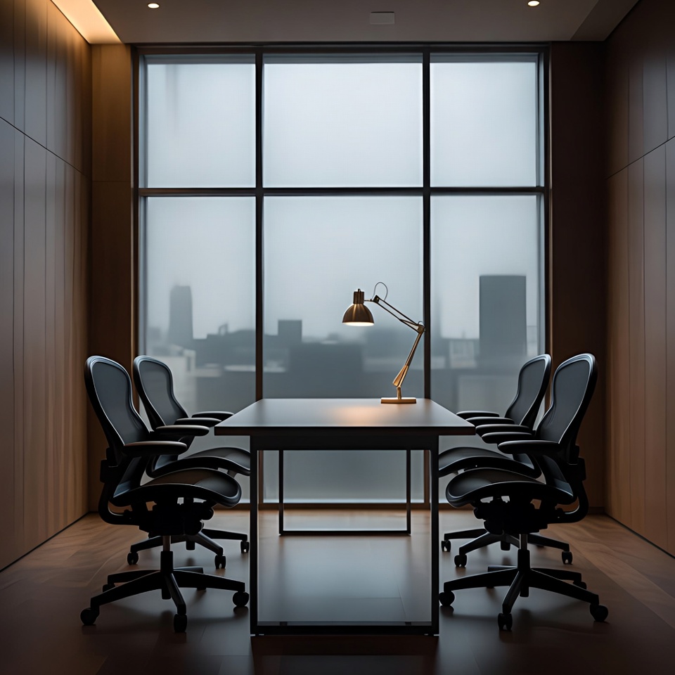A modern office features a rectangular wooden conference table surrounded by four black ergonomic chairs. A desk lamp illuminates the center of the table, casting a warm glow. Large floor-to-ceiling windows reveal a foggy city skyline view.