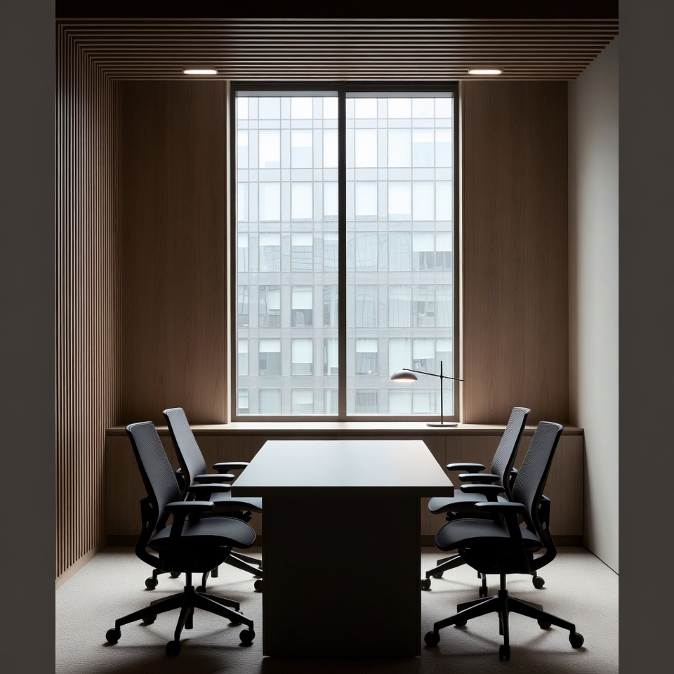 A contemporary office meeting room features a wooden slat ceiling and light wood paneled walls. Four black office chairs surround a rectangular wooden conference table, with a desk lamp positioned on it. Large windows offer a view of city skyscrapers and overcast sky.