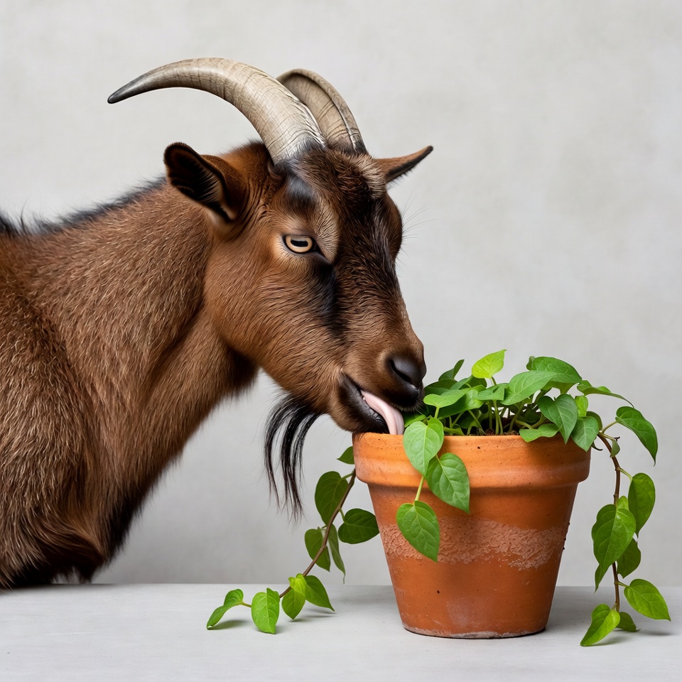 A brown goat with curved horns is eating green leaves from a potted plant. The plant features trailing vines in a terracotta pot on a plain gray background. The goat's face is close to the pot, with its tongue extended to reach the foliage.