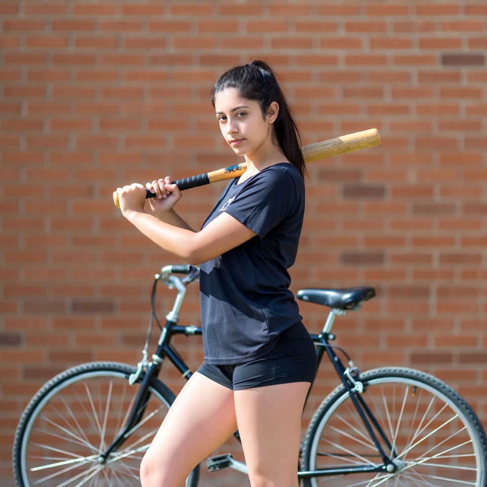 Asian, athletic pose, baseball bat, bicycle, bike, black shorts, black t-shirt, confident stance, dark hair, female, holding bat, outdoors, ponytail, red brick wall, sporty girl, woman, wooden bat, young, girl